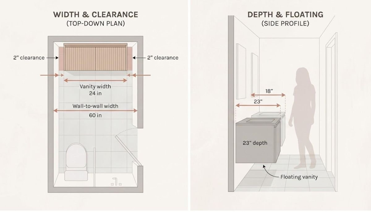 The fit question is ruthless. Measure wall to wall, then subtract at least two inches on each side so drawers don’t clip the tile. Depth matters just as much; in a galley bath a 23-inch cabinet can feel like a barricade, while an 18-inch profile leaves breathing room. Float the vanity and the floor stretches visually under it; the whole room feels lighter, a trick designers rely on constantly.